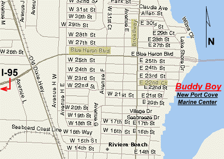 Take I-95 to the Blue Heron Blvd exit, turn east onto Blue Heron, continue to US Hwy 1, (Broadway), turn right, going south on Broadway 4 blocks to E 22nd. Turn left, going east, on E 22nd 2 1/2 blocks to the end of the street. Buddy Boy is in the second slip at New Port Cove Marine Center... Start to Finish Site Index |
