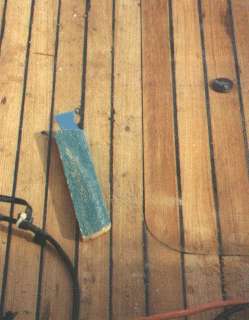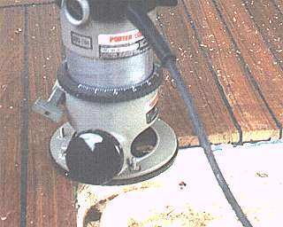 The hatch openings on this boat have rounded corners outboard and the boards were left a bit long over these areas. A carbide flush cut bit is used to match the opening to the recess prior to fitting the hatches.