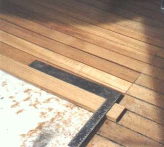 The hatches are leveled and wedged into the openings so that the boards can be fitted and matched to the deck. The boards are dry fitted, registered, and epoxied down in the same manner as the rest of the deck.