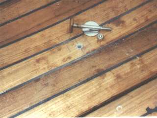 I used custom stainless steel button pulls that lay flat, only stand off of the deck by 1/8". Since the hatches are foam cored, the hole must be sealed so that water does not find it's way into the foam. To accomplish this, I use 1/4" i.d. polypropylene tubing driven in to an undersize hole, then flush cut.