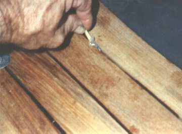 As soon as the last board in the group is down, go over all of the spaces between the boards and remove ALL excess epoxy. I find a wooden kitchen match to be an excellent tool for this purpose. Be sure to get around the screws and under the fender washers!