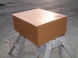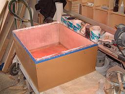 The first resin coat is thinned by 20% with top coat lacquer thinner for better penetration into the MDF.If you've done a good spray job, no drips, runs, or sags, there will be very little finish sanding needed to have a smooth deep surface of about 10 - 12 mils. In the case of my battery box mold, there will be no sanding done at all. This will leave a very slight texture to the gelcoated surface, but then it's a battery box down in the bilge. Cosmetics are not the most important issue here, saving the customer's money is... Method To My Madness:Most molds and plugs are designed with one or more air fittings. By injecting air between the mold and the fiberglass part, the part is literally freed for removal. Because of the simplicity of this mold and the projected installation of the fiberglass box, I'll just leave the base free. It will be screwed into place and the bottom seam will be filleted in using modeling clay.This technique is much faster and the lower corners don't need to be perfect. They will however be damn near it... Removal of the fiberglass part will be done simply by unscrewing the base of the mold and pushing it out. The clay can be cleaned off of the mold and it's ready for another part to be laid up when and if the occasion arises. Secondary uses: While this has been made as a mold for a battery box, the calculated volume, allowing for a 1/4" wall thickness is 6,326 cubic inches which would hold over 25 gallons of liquid. Holding tank? Water tank? Spare fuel tank? The fiberglass Battery Box:The finished mold is prepared by waxing on several coats of mold release wax, assembling it, and working in the clay fillets at the bottom joint. With the bottom removable, waxing is very easy and finger wiping in the clay fillets only takes a few minutes.