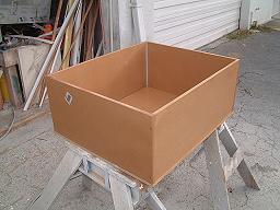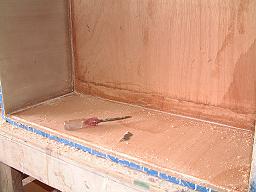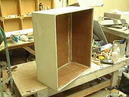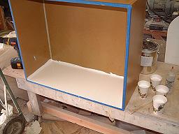 Since this will not need to be a production mold, capable of reproducing many parts, the design will be very straight forward, simple, and yet capable of reproducing as many as a dozen boxes if needed. The first step is to determine your needed dimensions and cut out the 5 sides. I'm using MDF board here, but plywood would also work if you don't have access to MDF. The MDF will save you many hours of filling sanding, and fairing, since the MDF is very true, has no grain texture, and is easily sealed. Here, the mold was made using three 2' x 4' pieces of 1/2" MDF from a home improvement center, at a cost of under $14.00. Like all molds and plugs, you must incorporate a slight positive draft so that the top of the mold opening is just a bit larger than the bottom. This will allow the fiberglass part to be removed from the mold without destroying it. On the two opposing sides that fit between the ends panels, I cut each end on a 88 degree angle. When fitting the pieces together, the sides are also allowed to slant inward on the short edge. This will result in my positive draft on all sides. After the box has been dry fitted, only the 4 side walls are screwed and glued into place. The bottom has been fitted, (it's what will dictate your box being square), but will be left as a removable piece. More on that decision later. The first image shows the 4 sided box getting finger wipe fillets in each corner. Fillets are important both to strength of the mold joint and in laying up the fiberglass. The also give a more attractive appearance to the corners of the finished box.