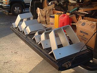 Below is the forward port engine ramp, again in 6061-T6 Aluminum. The angle and dimensions of the ramps were obtained by actually setting an engine in place, shimming it up to the correct position with scraps of wood, and then making templates for the ramp profiles. Since all bed dimensions were very close the same on both sides, only one engine was done, using the templates for both sides. The starboard ramps are a mirror image of the port. These ramps were done in 1/2" stock, but 3/8" would have been better, plenty strong enough, and is what I'd use next time. The whole set, acid washed, alodined, and ready for installation.