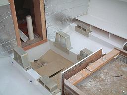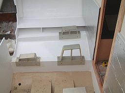 The next two images show the ramps setting in place after the spaces have been Awlgripped. I have waxed paper under each ramp to keep from scratching the paint. In final installation, there will be 2mm PVC Foam Board isolators under each ramp. The outboard aft motor mount will rest on a 1/2" aluminum plate; no ramp. This was all configured to allow the engines to be at their lowest installation when complete.